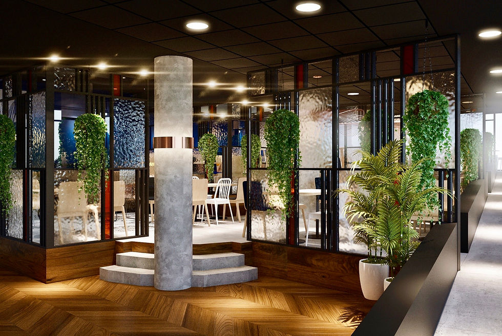 Nowa odsłona wnętrz restauracji i baru. Pracę nad projektami modernizacji wnętrz rozpoczynam zawsze od analizy stanu technicznego i oceny tego, co można zachować, co należy odświeżyć a co wymienić. Projekt zakładał m.in. zachowanie istniejących posadzek, przemalowanie sufitów na kolor czarny, demontaż przegród oddzielających poszczególne poziomy restauracji. Na ich miejsce zaproponowałam pół-przezierne przegrody z geometrycznym wzorem, które zwiększają poczucie intymności, a także nadają wnętrzu wyjątkowy ton, nawiązując delikatnie do stylistyki minionych epok. Ściany zyskują nową kolorystykę: mocny granat i soczysty malachit. Dopełniają je sztukaterie i złote kinkiety. Wzdłuż ścian pojawiają się sofy, pokryte miękką, koniakową skórą lub tapicerką welurową w kolorze ciemno malachitowym. W barze sufit ozdabia złota blacha, a rozświetlają go kuliste lampy. Uzupełnieniem aranżacji jest wyposażenie meblami czołowych polskich brandów jak Noti Paged czy Fameg i wszechobecna zieleń.